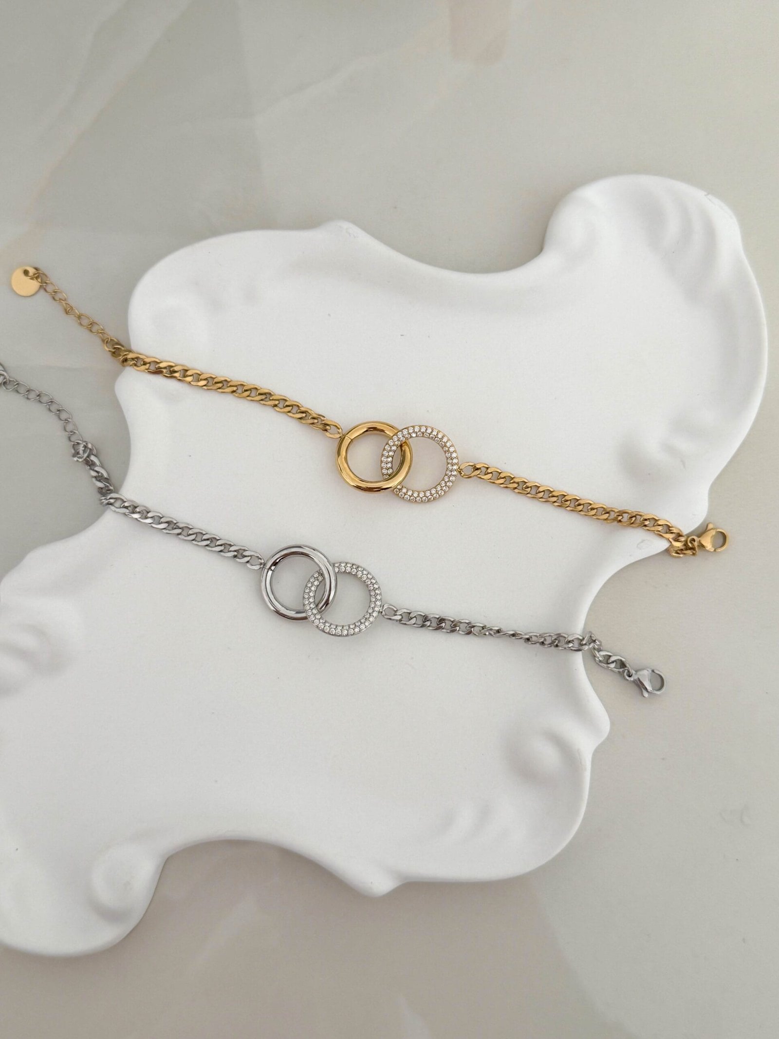 Κομψό και διαχρονικό βραχιόλι με αλυσίδα και δύο αλληλένδετους κρίκους, που συμβολίζουν τη σύνδεση και την αρμονία. Ο ένας κρίκος διαθέτει λεία μεταλλική επιφάνεια, ενώ ο δεύτερος είναι διακοσμημένος με λαμπερά ζιργκόν, προσφέροντας μια ισορροπία ανάμεσα στο minimal και τη διακριτική λάμψη.