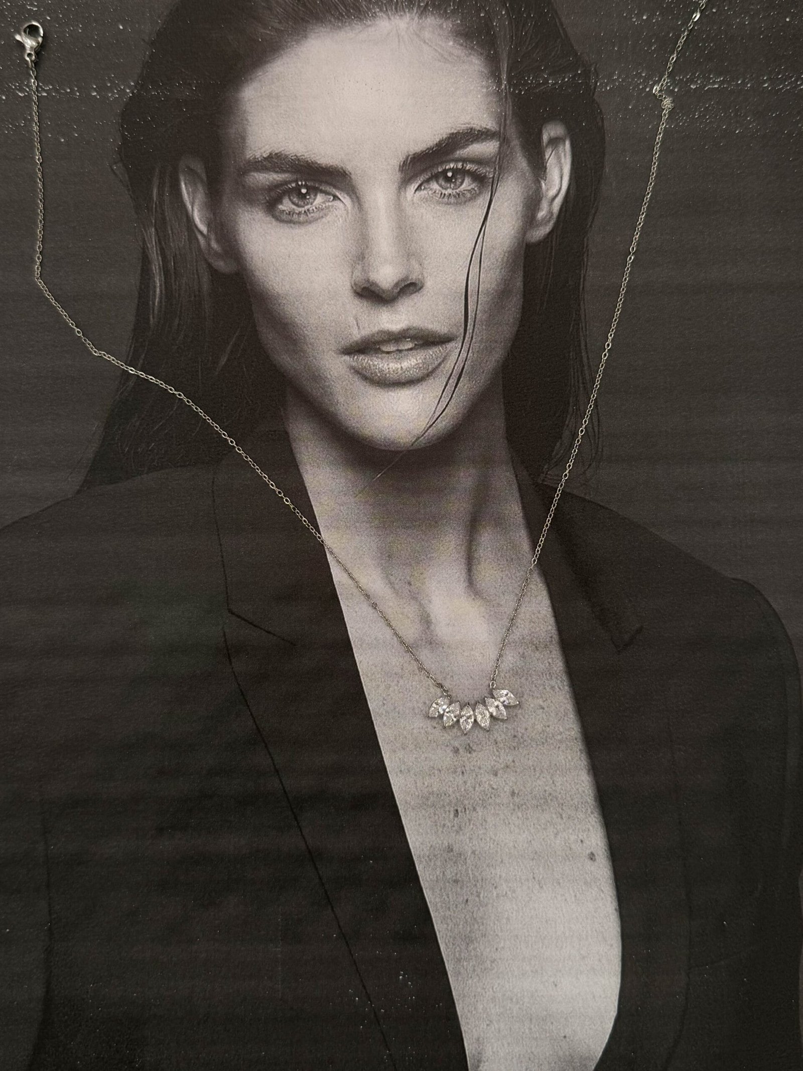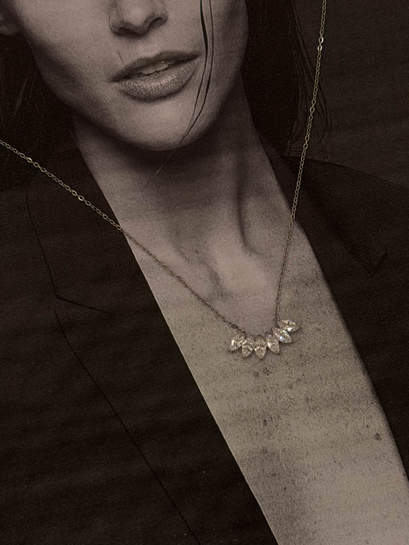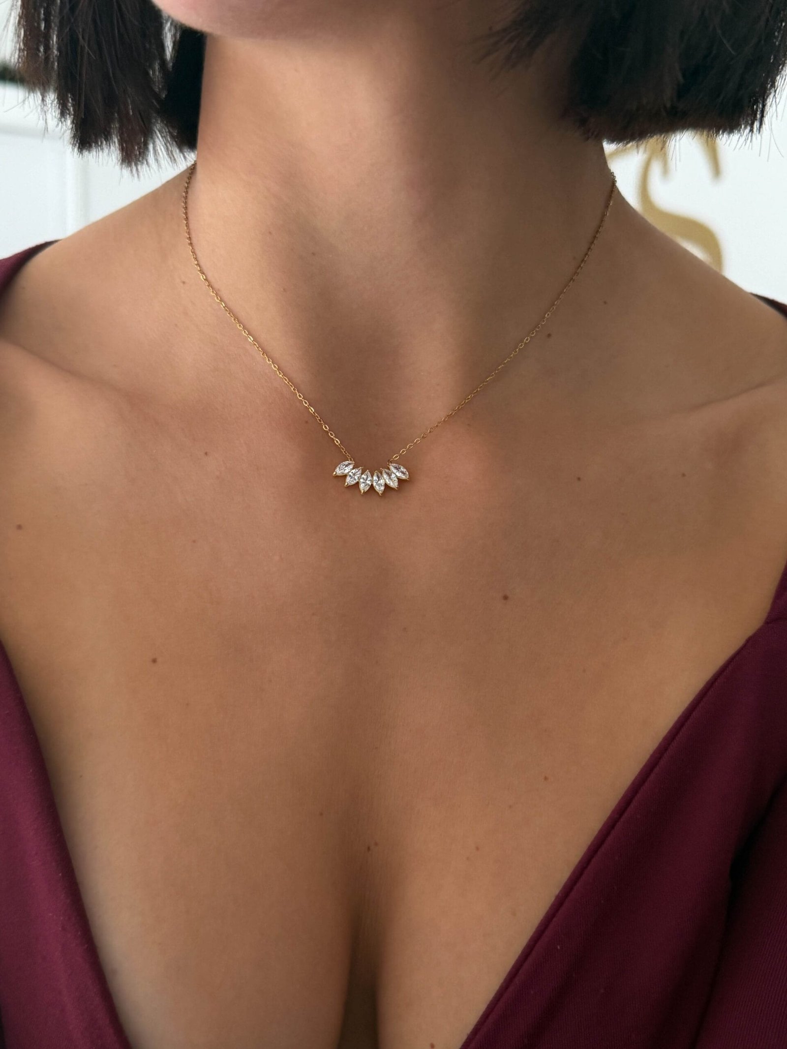 Διακριτικό κολιέ με έξι λαμπερά διαμαντάκια που χαρίζουν μια εκλεπτυσμένη, minimal λάμψη.