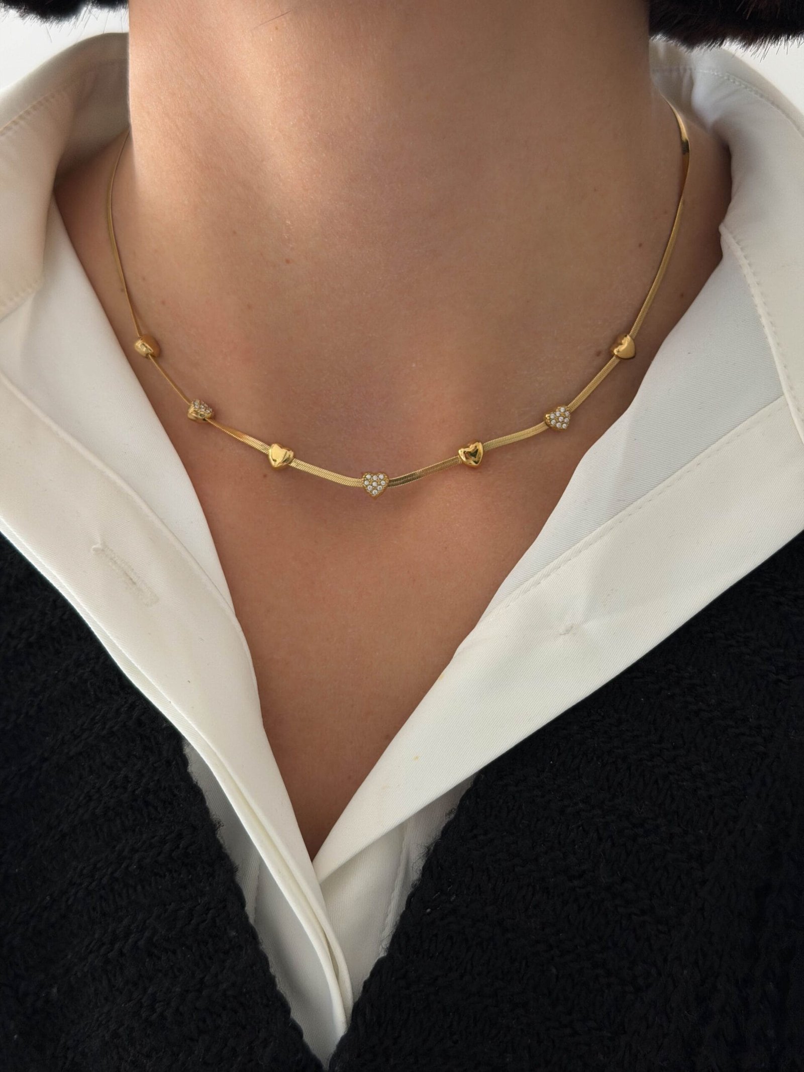 Κομψό κολιέ choker με διακριτικές καρδιές κατά μήκος της αλυσίδας, που προσφέρει ρομαντική αλλά μοντέρνα αισθητική. Ιδανικό για layering ή για να φορεθεί μόνο του ως minimal statement κόσμημα. Ένα διαχρονικό σχέδιο που συμπληρώνει κάθε εμφάνιση από το πρωί έως το βράδυ.