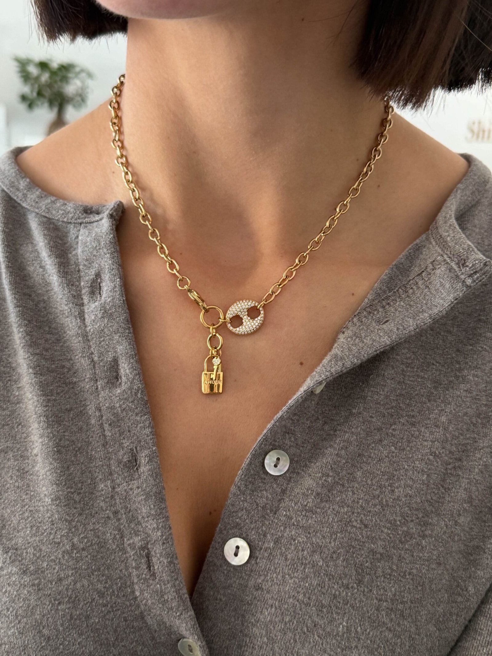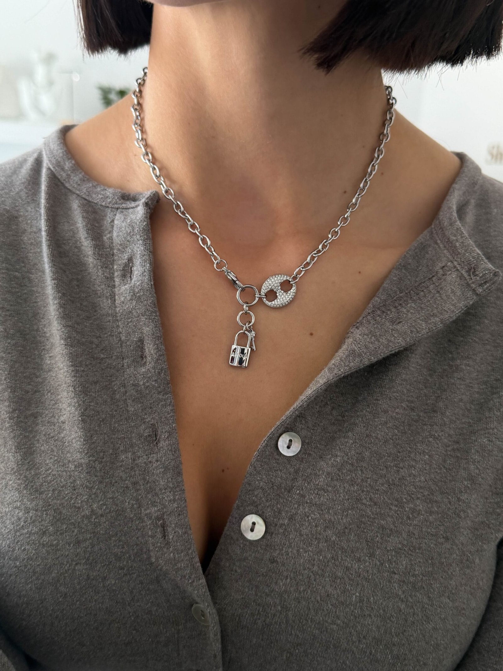 Εντυπωσιακό κολιέ με αλυσίδα τύπου chain και statement κούμπωμα, διακοσμημένο με λαμπερό pavé στοιχείο και κρεμαστό λουκέτο που προσθέτει δυναμικό και σύγχρονο χαρακτήρα. Ένα μοντέρνο κόσμημα που συνδυάζει urban αισθητική με κομψή λάμψη, ιδανικό για να αναβαθμίσει κάθε καθημερινό ή βραδινό look.
