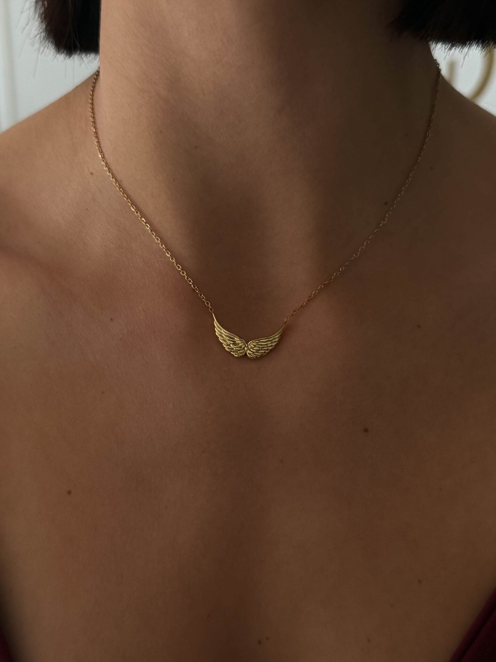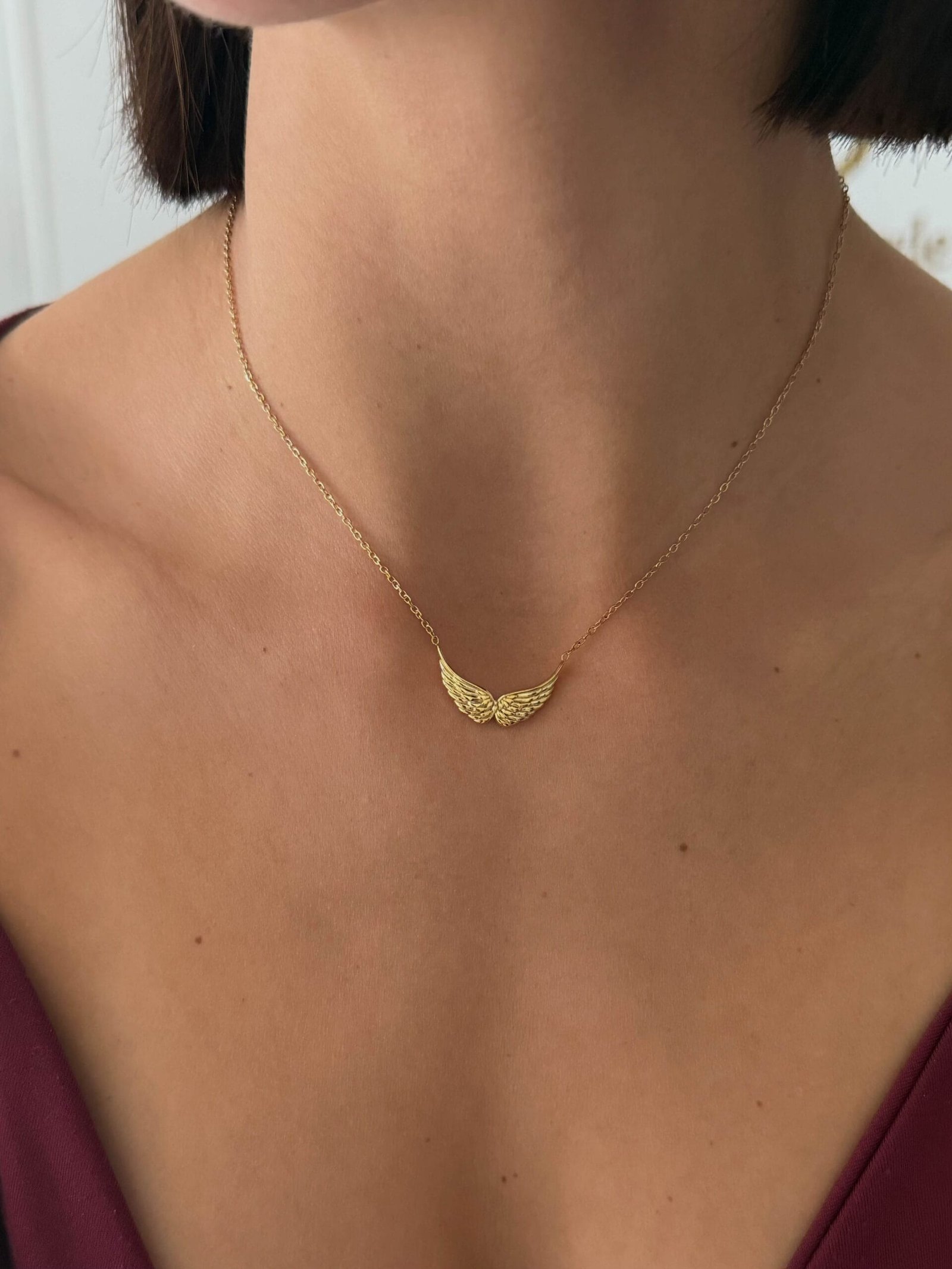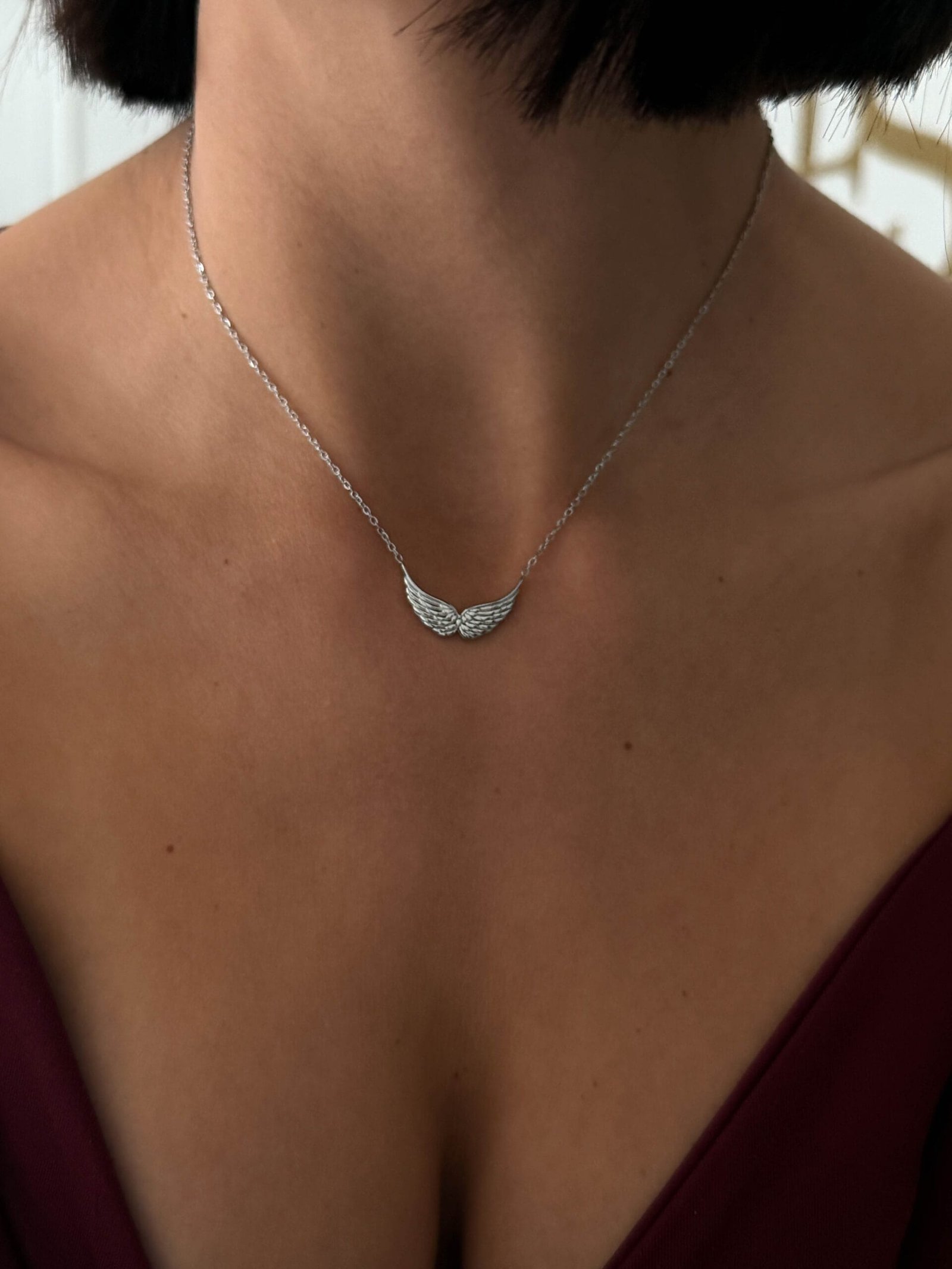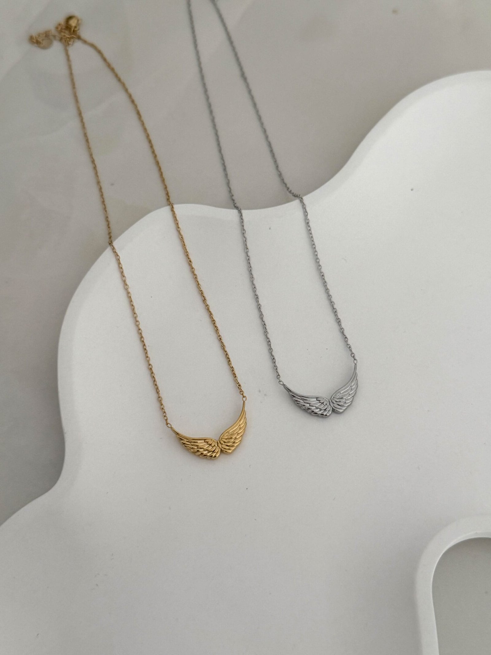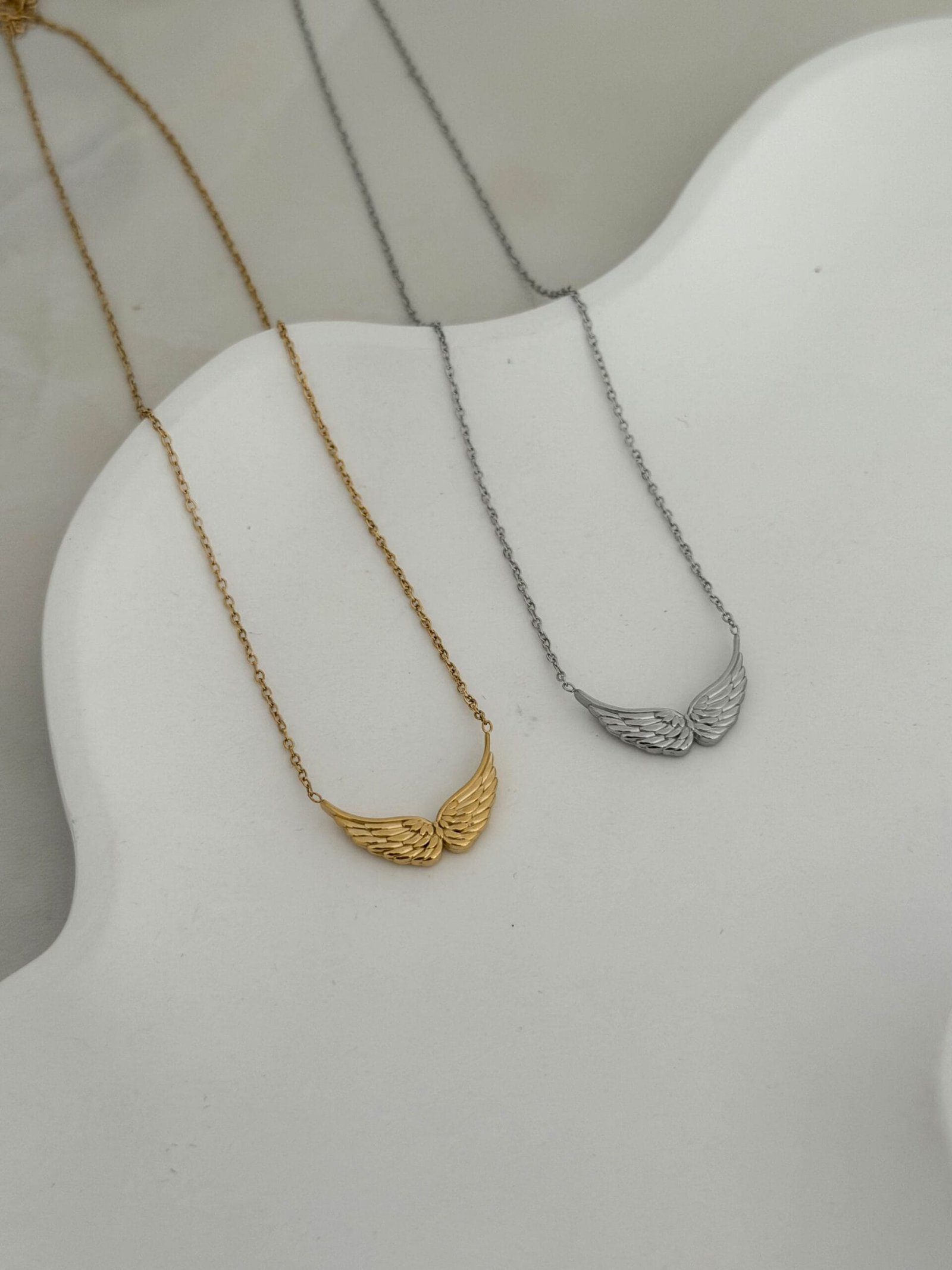 Οι ανάγλυφες λεπτομέρειες του φτερού προσθέτουν λάμψη και κίνηση, ενώ η minimal αλυσίδα το αναδεικνύει διακριτικά.