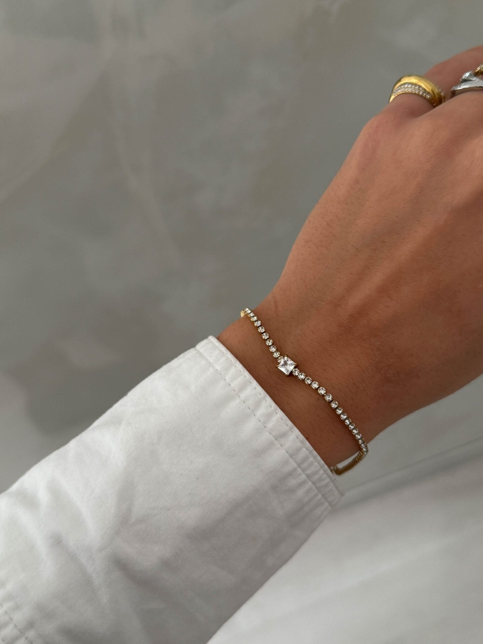 Ένα λαμπερό μπριγιάν στο κέντρο, πλαισιωμένο από διακριτικές πέτρες και δεμένο με λεπτή χρυσή αλυσίδα,