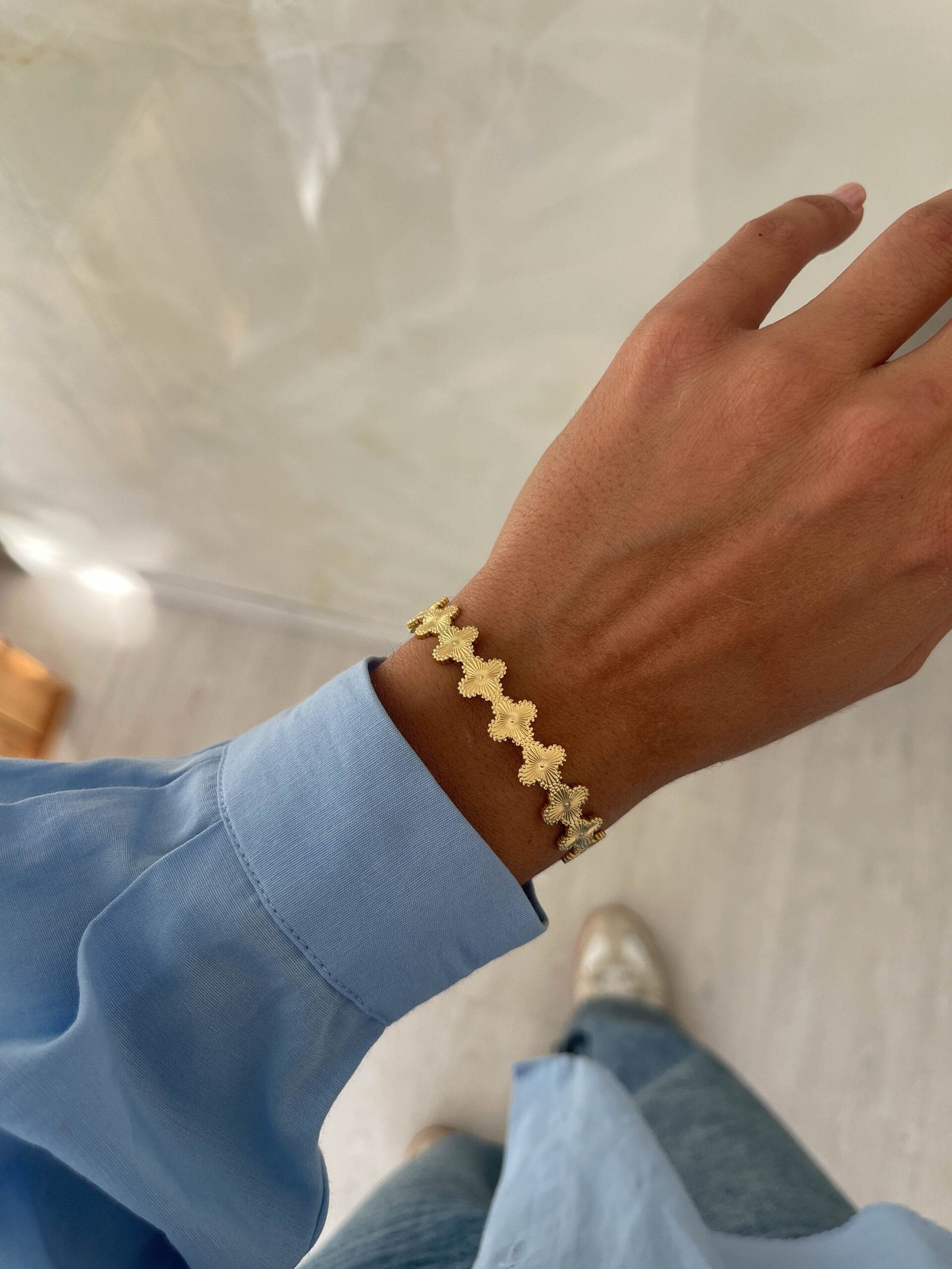 Η Aurora είναι μια χειροπαίδα που συνδυάζει τη διαχρονική κομψότητα του χρυσού με τον συμβολισμό του σταυρού, αποπνέοντας φως και ισορροπία.