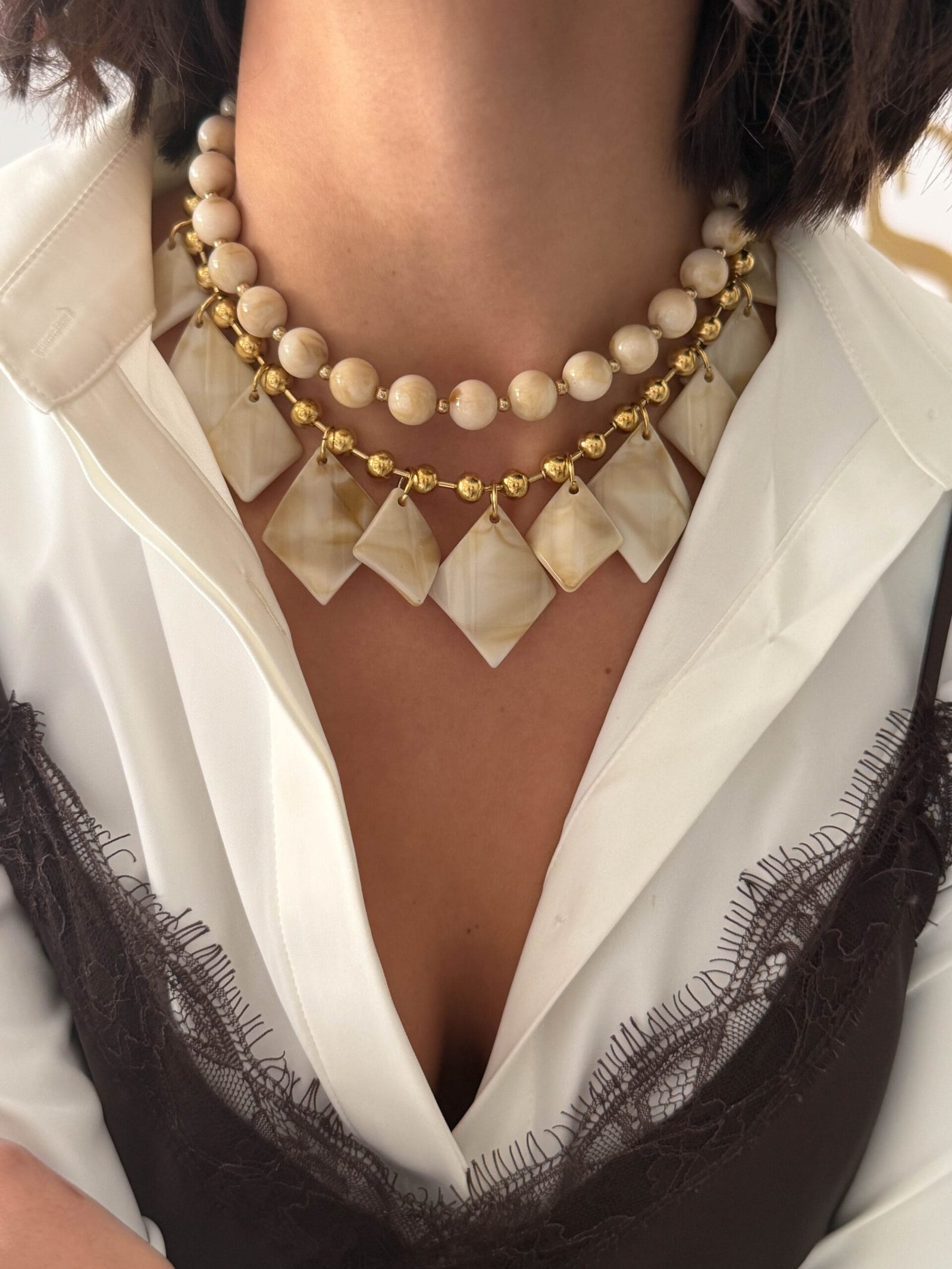 Διπλή αλυσίδα με χρυσές μπίλιες και κρεμαστές κοκάλινες λεπτομέρειες.