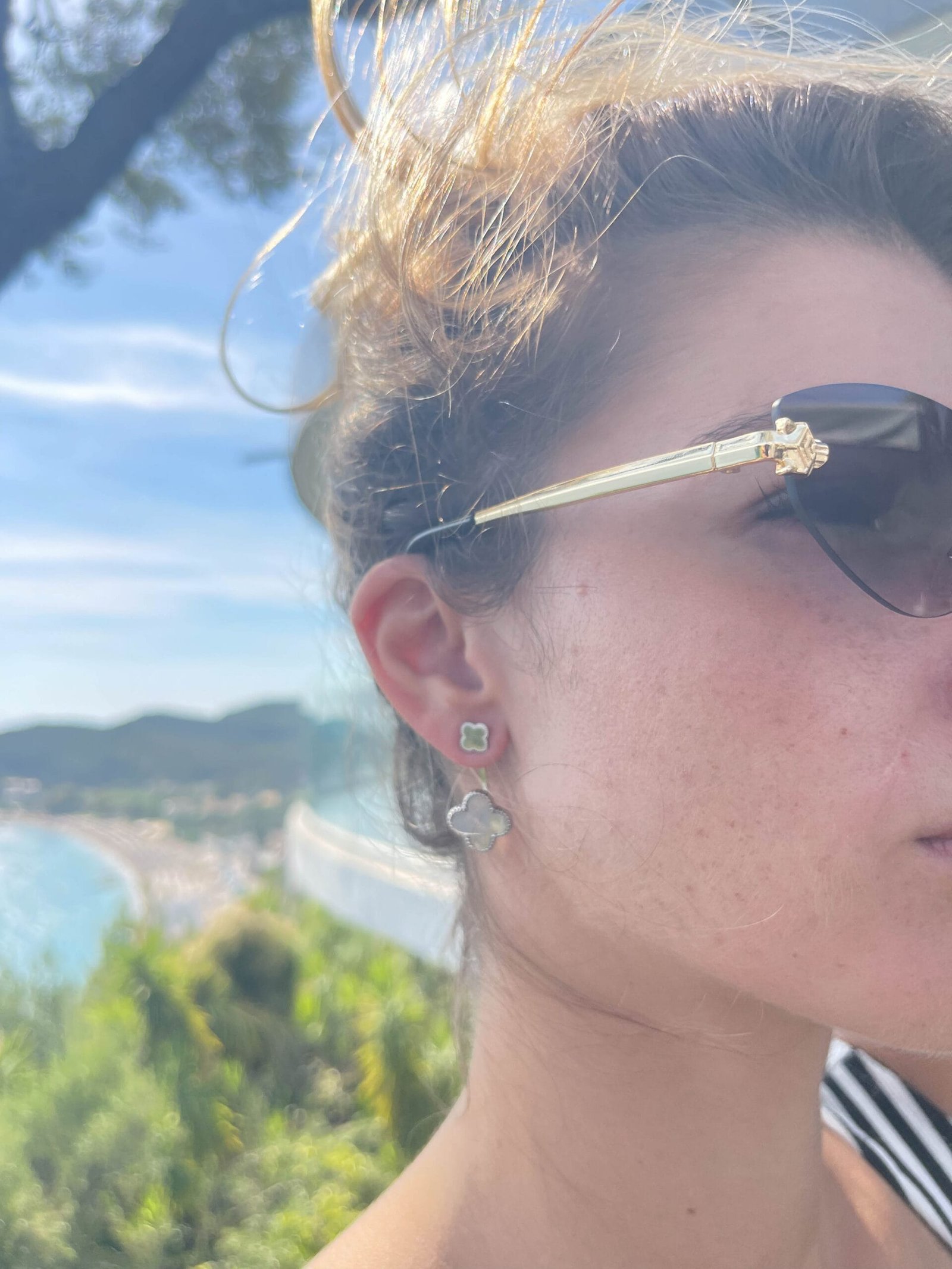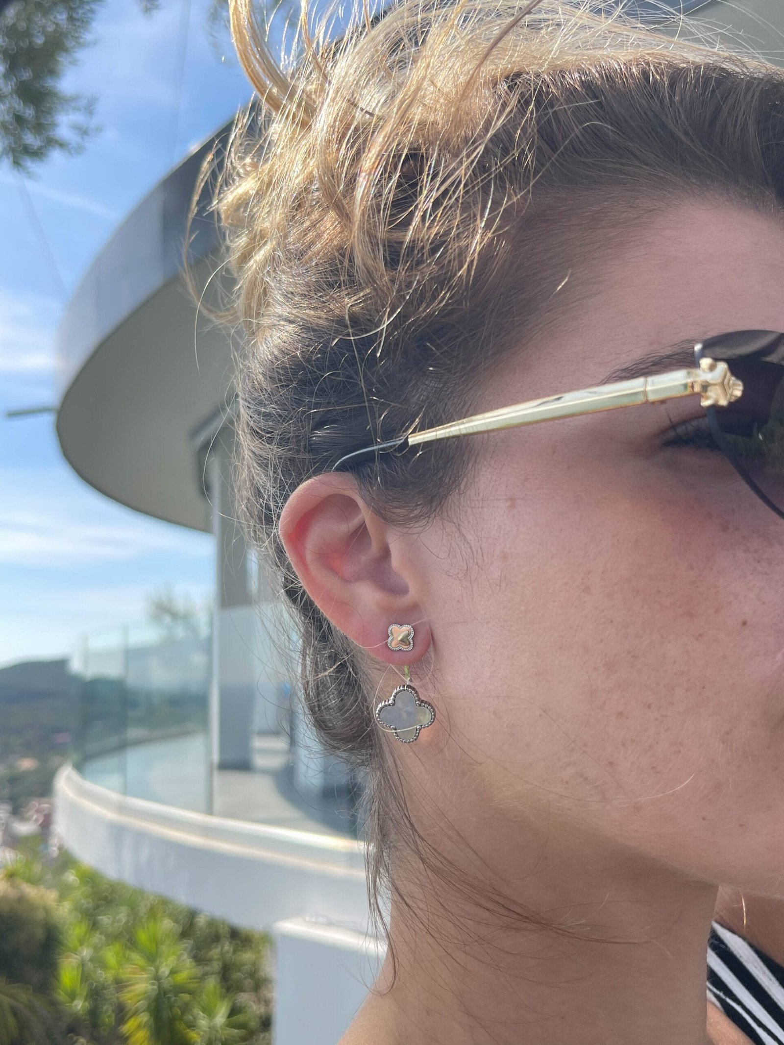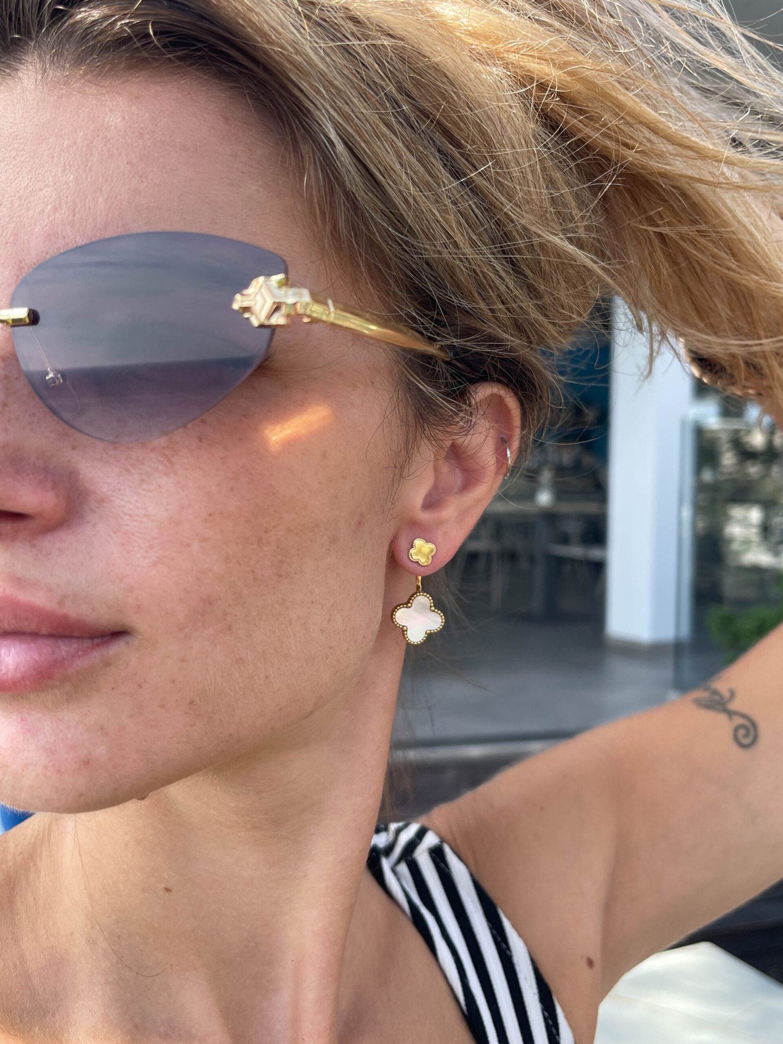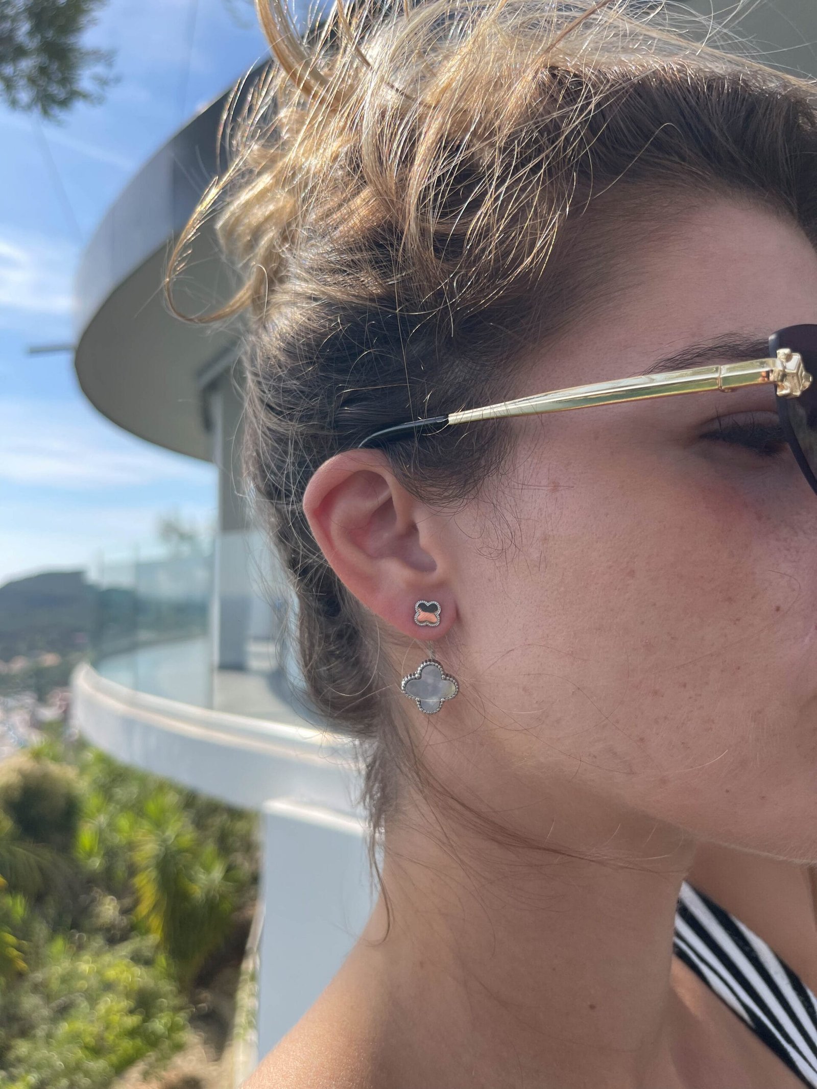 Κρεμαστά σκουλαρίκια με μικρό, διακριτικό μοτίβο πάνω στον λοβό, από το οποίο κρέμεται ένα μεγαλύτερο σχέδιο.