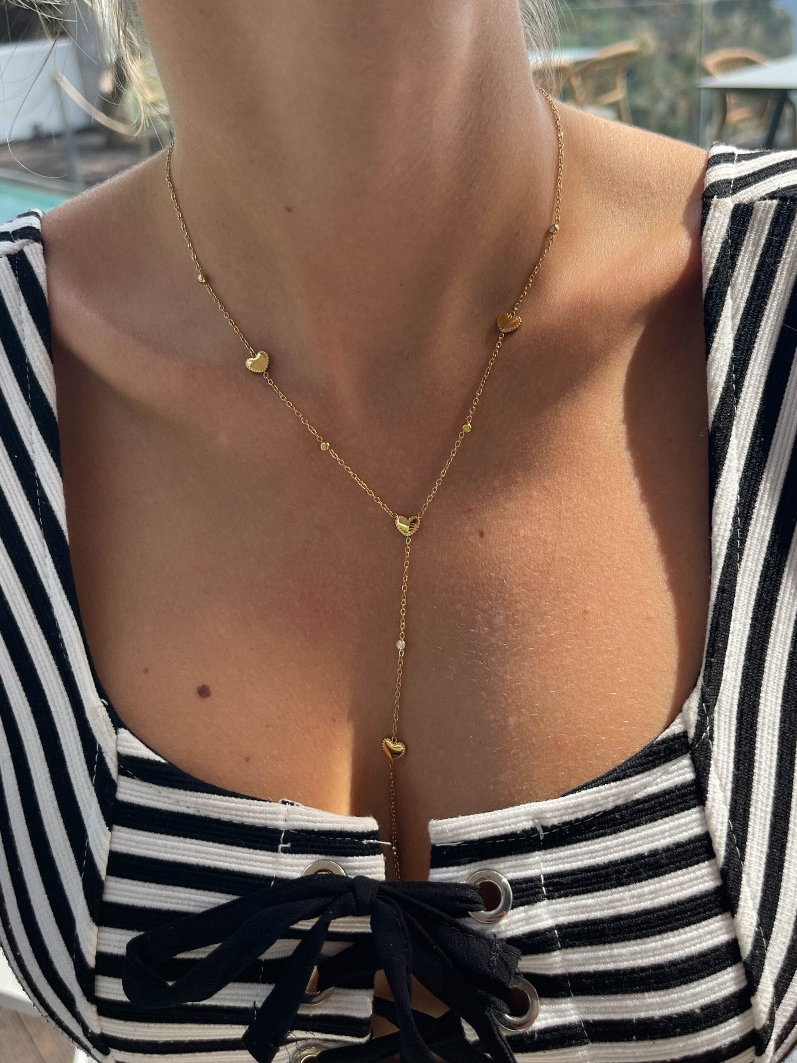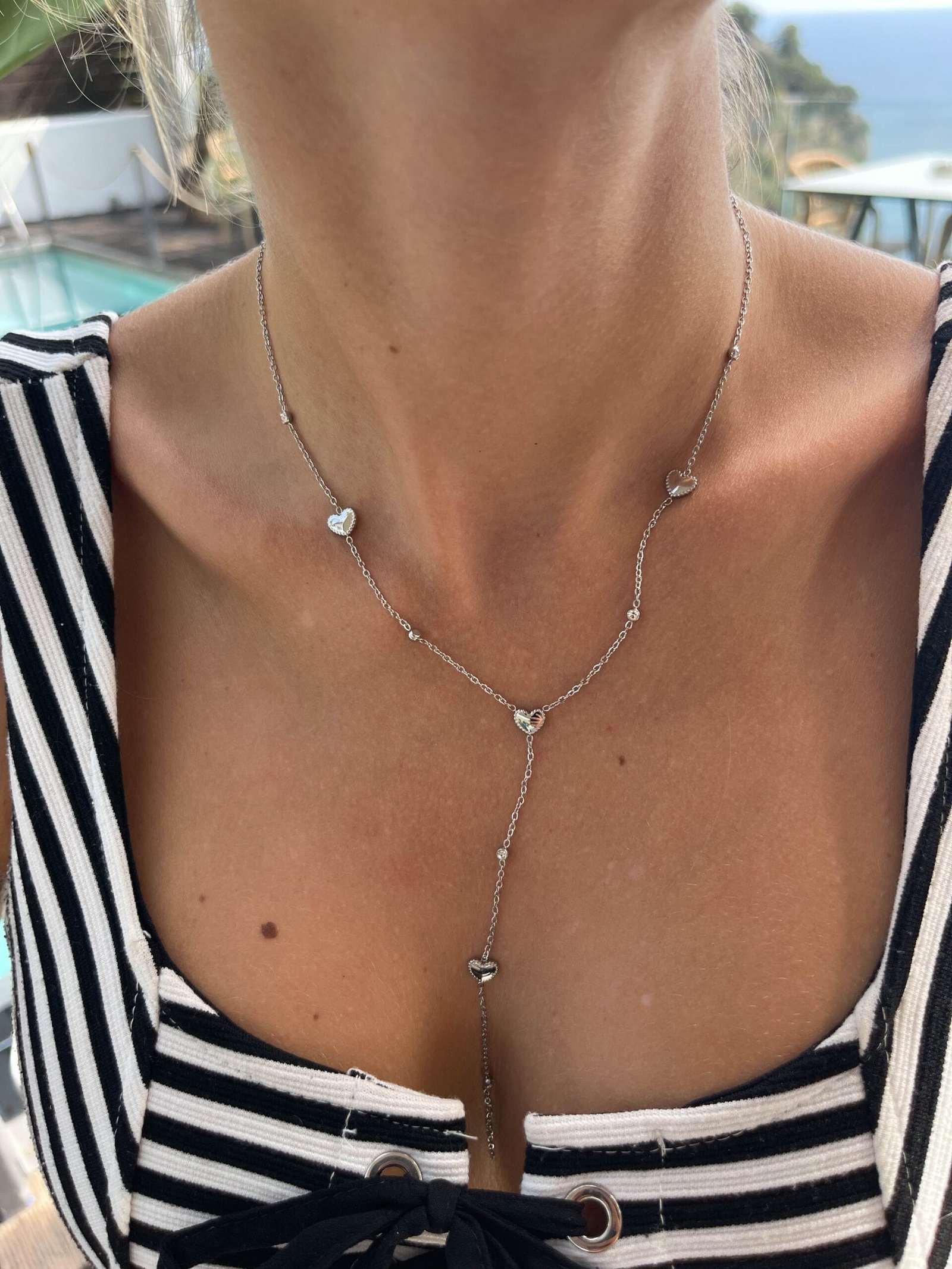 Το μακρύ του μήκος αγκαλιάζει τον λαιμό με χάρη, ενώ στο σημείο όπου ενώνεται αφήνει μια λεπτή αλυσίδα να κρέμεται,