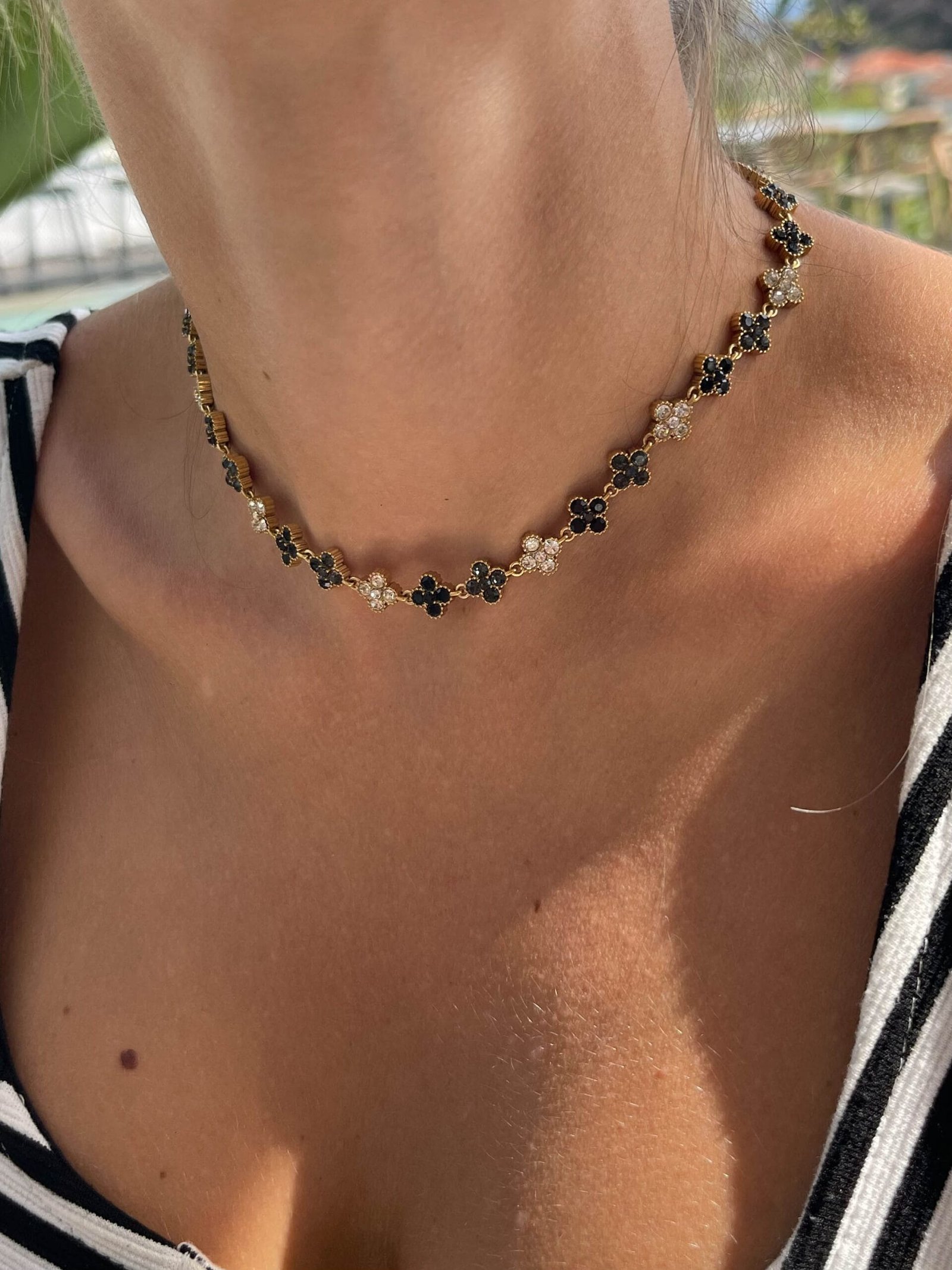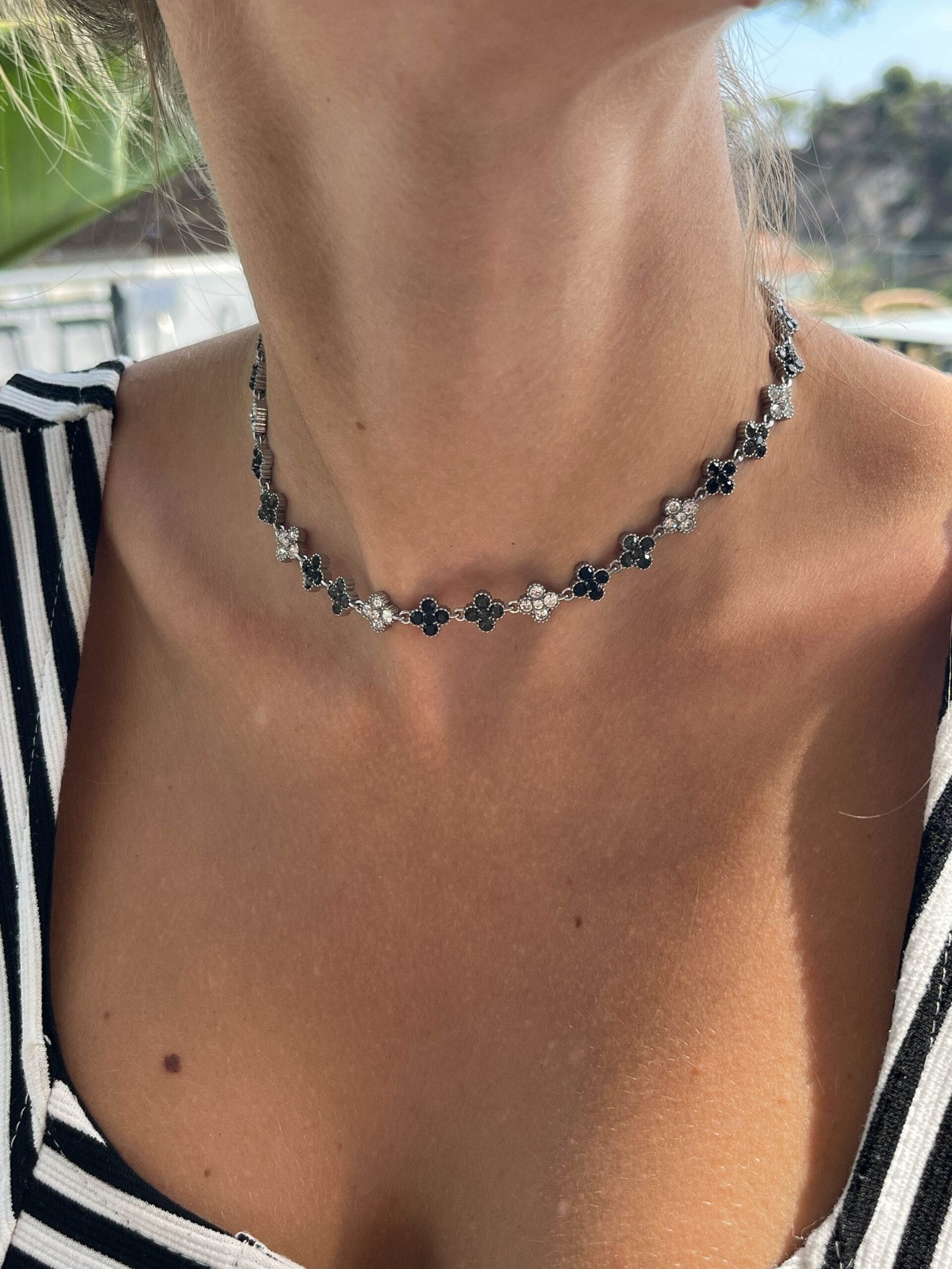 Στυλάτο τσόκερ με αποχρώσεις λευκού, μαύρου και γκρι, διακοσμημένο με διακριτικά στρας που προσθέτουν λάμψη και κομψότητα. Ιδανικό για να δώσει edgy και μοντέρνα πινελιά σε κάθε εμφάνιση, από καθημερινό look μέχρι βραδινή έξοδο.