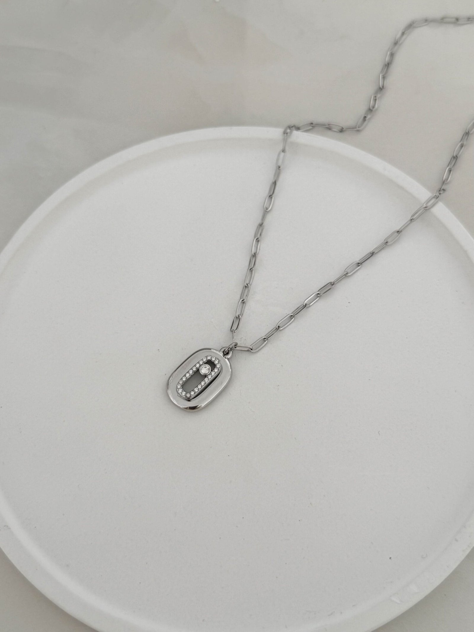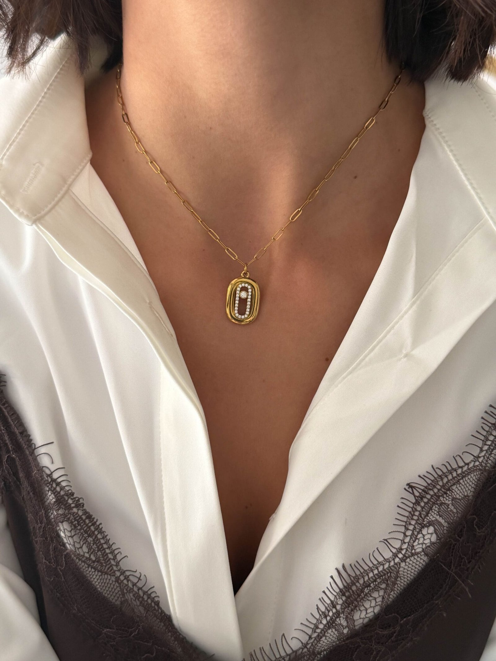 Ένα κομψό κολιέ με οβάλ κρεμαστό στοιχείο στο τελείωμα, διακοσμημένο με λαμπερά στρασάκια