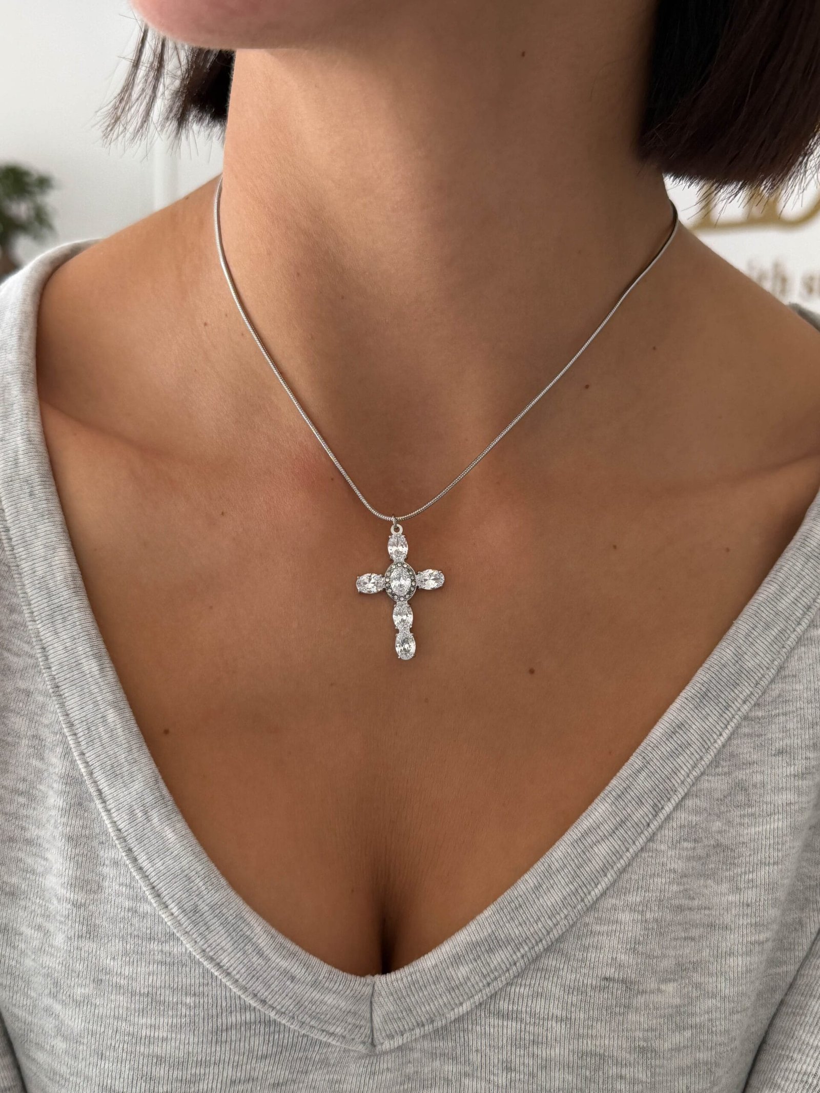 Ο σταυρός, στολισμένος με μεγάλες πέτρες ζιργκόν, αιχμαλωτίζει το φως σε κάθε κίνηση, ενώ στο κέντρο του σημείου που ενώνονται οι δύο γραμμές δεσπόζει μια λεπτή μεταλλική λεπτομέρεια με ένα στρας, προσδίδοντας μοναδική λεπτομέρεια και φινέτσα.